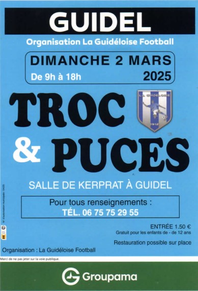 Belle fréquentation du Troc et Puces de la Guidéloise football Le dimanche 19 février s'est déroulé le Troc et Puces de la Guidéloise Football dans les salles de Kerprat à Guidel. Des bénévoles de l'association avaient préparé la salle le samedi matin. Certains exposants ont installé leur stand le samedi après-midi. Dimanche matin dès 6 h, les bénévoles étaient présents pour accueillir les exposants au nombre de 55.Vers 7 h, déjà des visiteurs se présentaient. C'était le début d'un flot incessant toute la journée. Au terme de laquelle, avec un temps un peu gris le matin, mais largement ensoleillé l'après-midi, 1 476 visiteurs payants étaient passés par les salles de Kerprat. Ce qui a ravi les organisateurs mais aussi et surtout les exposants. Beaucoup ont d'ailleurs promis qu'ils reviendraient. Le rangement des salles s'est déroulé dans la bonne humeur avec le renfort de quelques joueurs. La journée s'est terminée par un petit casse-croûte au local du club. Un grand merci aux exposants, aux visiteurs et aux bénévoles qui ont fait de cette journée une grande réussite. La Guidéloise Football (forte de 350 licenciés) organisera encore cette année :un tournoi pour les U6-U9 (6 mai) un loto (13 mai), un tournoi U11 (18 mai)*un tournoi U13 (20 mai) un troc et puces (9 juillet) un troc et puces en novembre XL
